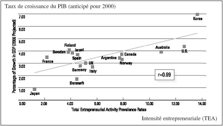 59        Cette mesure du GEM permet aussi de lier activité entrepreneuriale et croissance. Malgré les difficultés d’évaluation et l’imperfection des instruments de mesure, la figure 6, page suivante conduit à soutenir que la moitié de la croissance du PIB en 2000 pour les pays développés de l’échantillon s’explique par l’activité des entrepreneurs (Zacharakis, Bygrave et Sheped 2000). Les travaux récents confortent ainsi l’existence d’un modèle de croissance par le bas, fondé sur une multitude de petites décisions profitables.