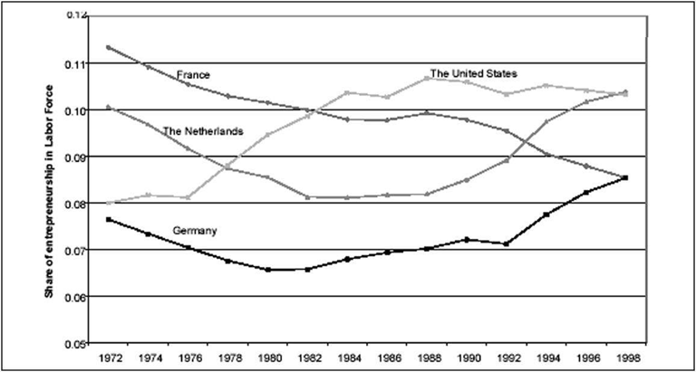 50        Les mauvais résultats en termes de croissance des pays de l’Union européenne, comparativement aux pays des autres continents (Amérique du Nord, Asie du Sud-Est), souvent qualifiées d’euro-scléroses, peuvent alors s’expliquer par le scepticisme des Européens vis-à-vis de modèles de croissance comme ceux que l’on a observés dans la Silicon Valley. Les Européens ont concentré leurs moyens et leurs stratégies sur la constitution de pôles de développement capables de produire des leaders mondiaux dans des domaines technologiques très avancés au détriment des zones de développement diffus entraîné par des grappes de petits entrepreneurs. Les autorités européennes voulaient lutter contre les multinationales américaines (General Motors, U.S. Steel, IBM) sans percevoir la menace que constituaient les biotechnologies et/ou le développement des industries du software. Les performances, dans ces domaines, des entrepreneurs de la Silicon Valley ont, pourtant, obligé les autorités européennes à modifier leur point de vue. L’Union européenne a alors reconnu, au milieu des années 90, la soutenabilité de cette forme de développement et commencé à douter de la soutenabilité de son modèle industriel et social. Elle constatait, en effet, que les USA continuaient d’avoir des taux de croissance importants, soutenus par une forte activité entrepreneuriale alors que des pays comme la France ou l’Allemange souffraient d’une baisse continue du nombre de leurs entrepreneurs et de taux de croissance faibles (figure 2). L’économie entrepreneuriale était redevenue un modèle envisageable (Audrestch et Thurik 2000).