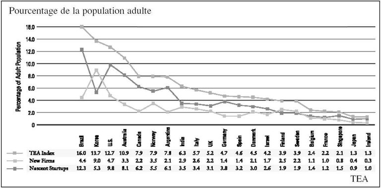 58        Les travaux du Global Entrepreneurship Monitoring (GME) préfèrent évaluer l’activité des entrepreneurs par la construction d’un index d’activité entrepreneurial (TEA), qui est la somme des entreprises naissantes (les gens en train de monter une affaire) et des nouvelles entreprises. L’index TEA est une nouvelle mesure développée par le Global Entrepreneurship Monitoring. Cet index mesure par enquête l’intérêt que la population active porte à la création d’entreprise. Le TEA français est très bas (2,2) alors que celui des États-Unis est beaucoup plus élevé (12,7). Cela signifie qu’en France, moins de 3 % des personnes en âge de créer une entreprise (adultes) sont tentées par la création d’entreprise. La création d’entreprise séduit plus d’un Américain sur dix, mais seulement un Allemand sur 25 (figure 5). Cela confirme la thèse selon laquelle le manque de créateurs d’entreprise nuit à la croissance européenne et entretient l’eurosclérose.