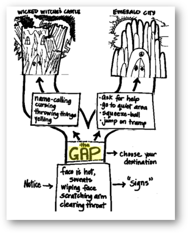 Using the visual model allows for students and teachers to stop and work through the stressful moment, or the moment of decision ("mind the gap") before taking action. This technique is effective with students with autism, but also effective for teaching children and youth of all ages, stages, and abilities, particularly those who may struggle with self-regulation. That is, the ability to notice, and recognize emotions and responses in oneself, and to make choices to control them. This model helps children and youth to put on paper (or on a whiteboard or chalkboard, written in sand, whatever works in the setting) and see the choice available to them, consequences of the choice, and also to identify the starting point (the point at which an action is called for).
