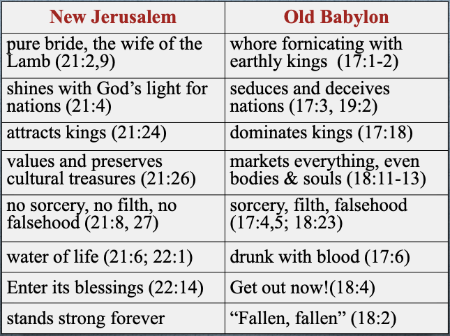 The New Jerusalem shines with God’s light for the nations. Old Babylon seduces and deceives and darkens the wisdom of the nations.